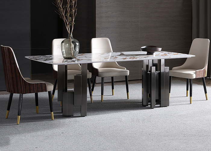 Partie supérieure du comptoir de marbre épaisses, texture en pierre minimaliste, soigneusement poli, lisse et sensible comme la peau d'une fille. Jambes créativement renforcées de table de fer travaillé. Processus de cuisson à hautes températures de peinture, non facile à se rouiller, effort stable, précision polie sans bavures.